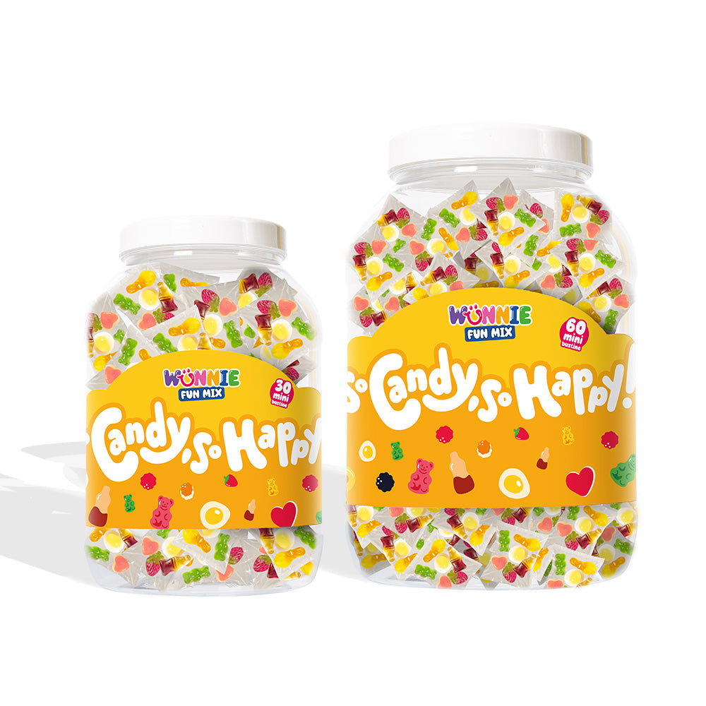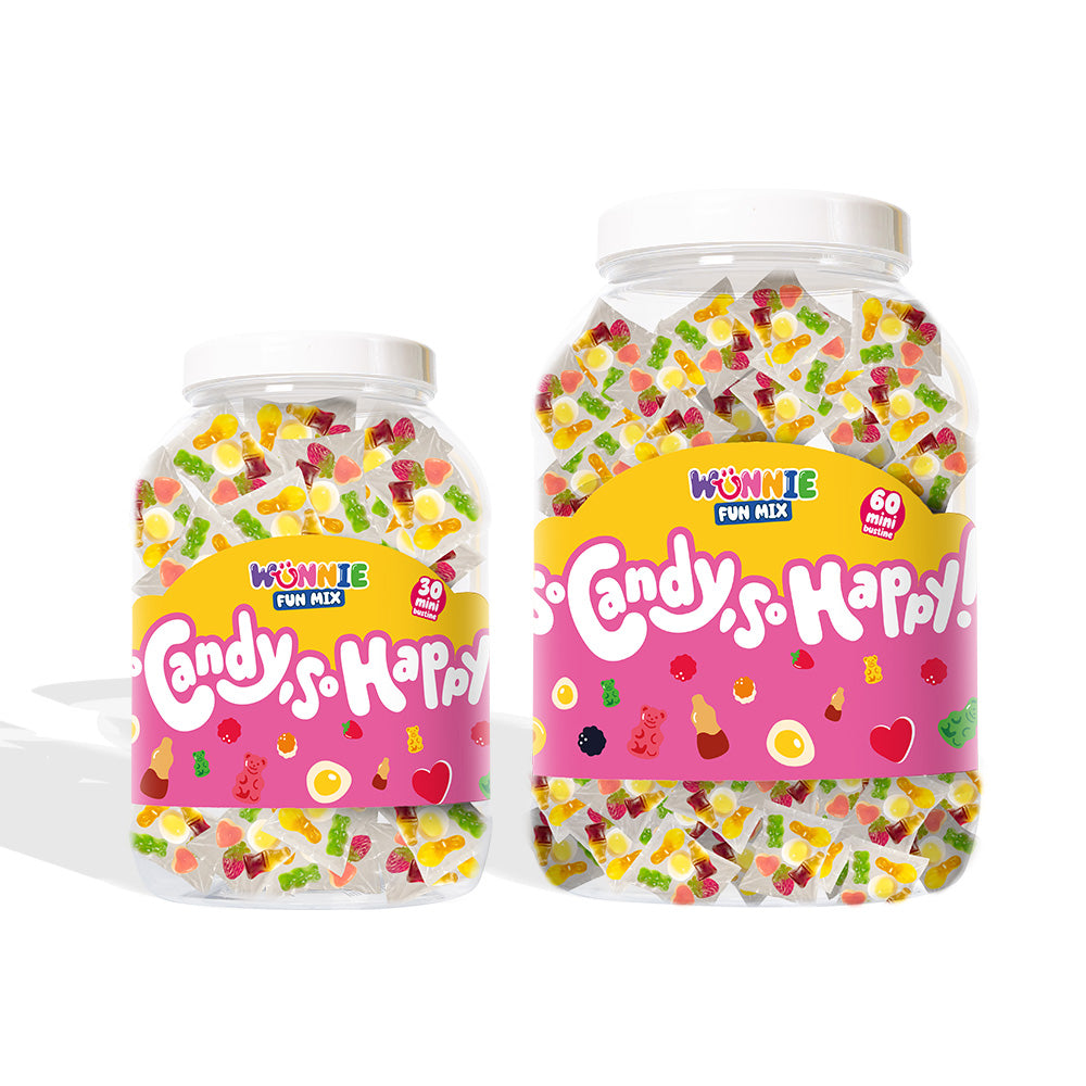 Wunnie Fun Mix is een pot die 30 of 60 eenpersoonszakjes bevat, elk met 20 g gummies in gemengde smaken!
