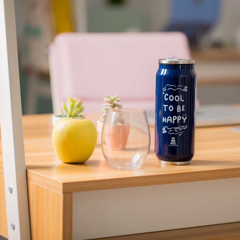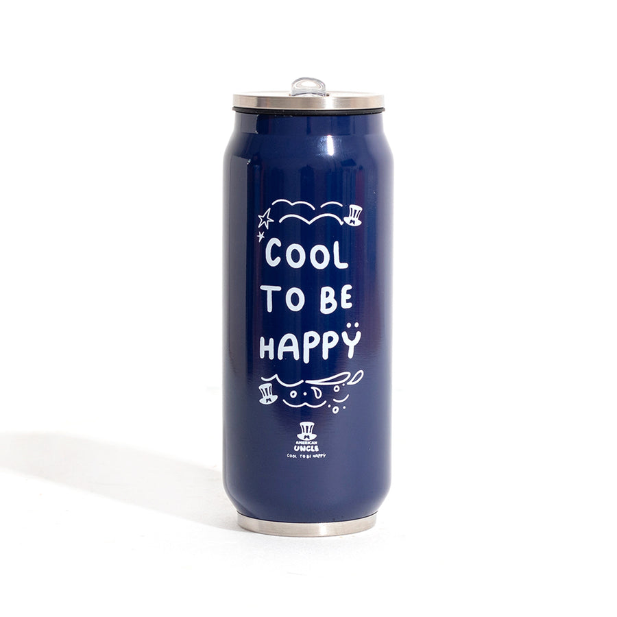 Fles Cool to be Happy, fles gemaakt van duurzaam staal van 500 ml met geïntegreerd antibacterieel rietje, blauwe kleur met witte tekst Cool to be Happy, 6,3 x 17,5 cm.